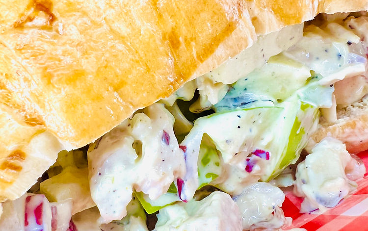 Well, we HAD to make some for ourselves! We used celery, red onion, green apple, sliced almonds, baked chicken breast (one pound), a tablespoon of sugar, and salt and pepper to taste. THEN we put it on two beautifully, delicious croissants courtesy of Bernardo from Panaderia Ortiz Bakery!
